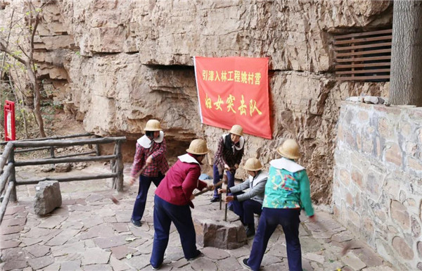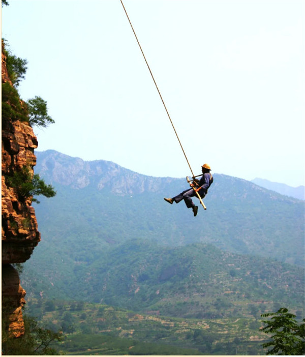 系繩索在懸崖峭壁間飛來蕩去的“除險(xiǎn)隊(duì)員”和一群掄錘扶釬的“鐵姑娘”引領(lǐng)游客們穿越時(shí)空,一起感受林縣兒女敢叫日月?lián)Q新天的壯志豪情。