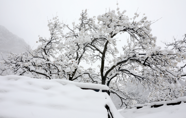 環(huán)顧四周,雪隨處可見(jiàn)!只見(jiàn)樹(shù)杈上、枯草上、石頭上,都開(kāi)出了潔白的花。