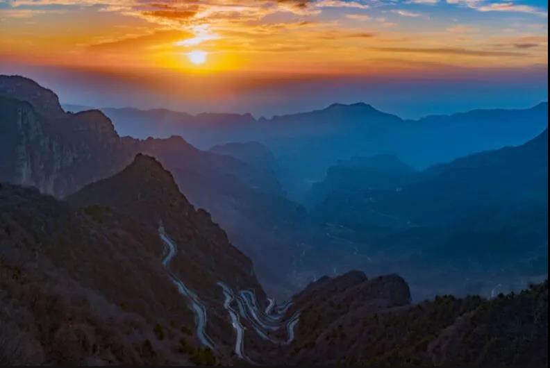 當天色漸晚,時光悄悄溜走,極目遠眺,太陽已收起耀眼奪目的光芒,溫和的映照著綿延起伏的山巒,群峰沐浴在余輝的彩霞里。就讓自己陶醉在這美景之中,戀戀不舍的與夕陽道聲“再見”。