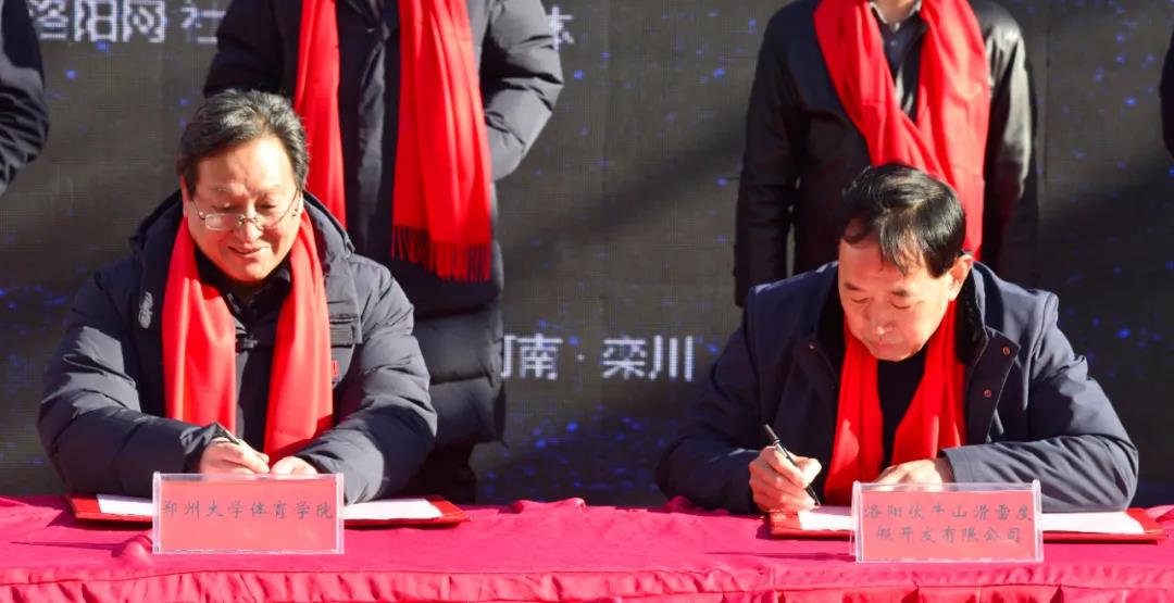 開幕式上,鄭州大學(xué)體育學(xué)院與洛陽伏牛山滑雪度假開發(fā)有限公司正式簽署合作協(xié)議并進(jìn)行授牌、揭牌儀式。