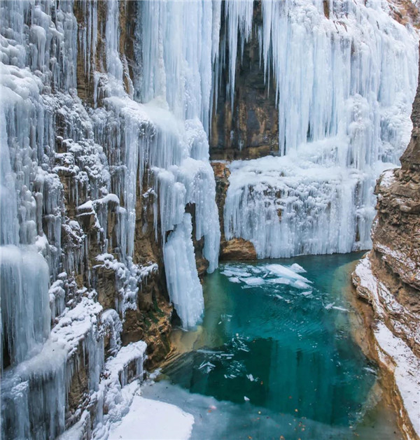 飛濺的浪花和彌天的水霧,凝結(jié)成壯觀的冰瀑晶瑩剔透,惹人沉醉。