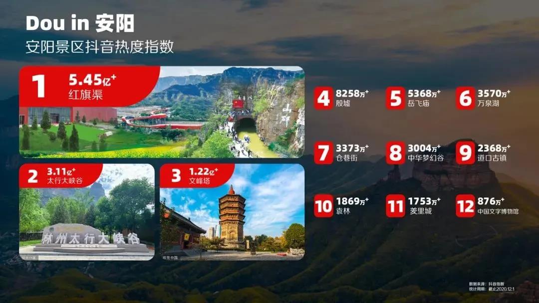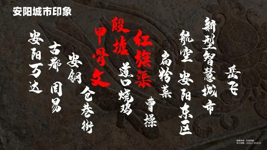 本次大賽從2020年9月25日開始至11月25日結(jié)束。在為期兩個月的時間里,共收到參與作品6600余條,播放量超2.8億次,點贊超過495萬次,眾多創(chuàng)作者打卡安陽地標、分享安陽美食、感受安陽文化,“紅旗渠”與“殷墟”“甲骨文”“倉巷街”等成為安陽的代名詞。