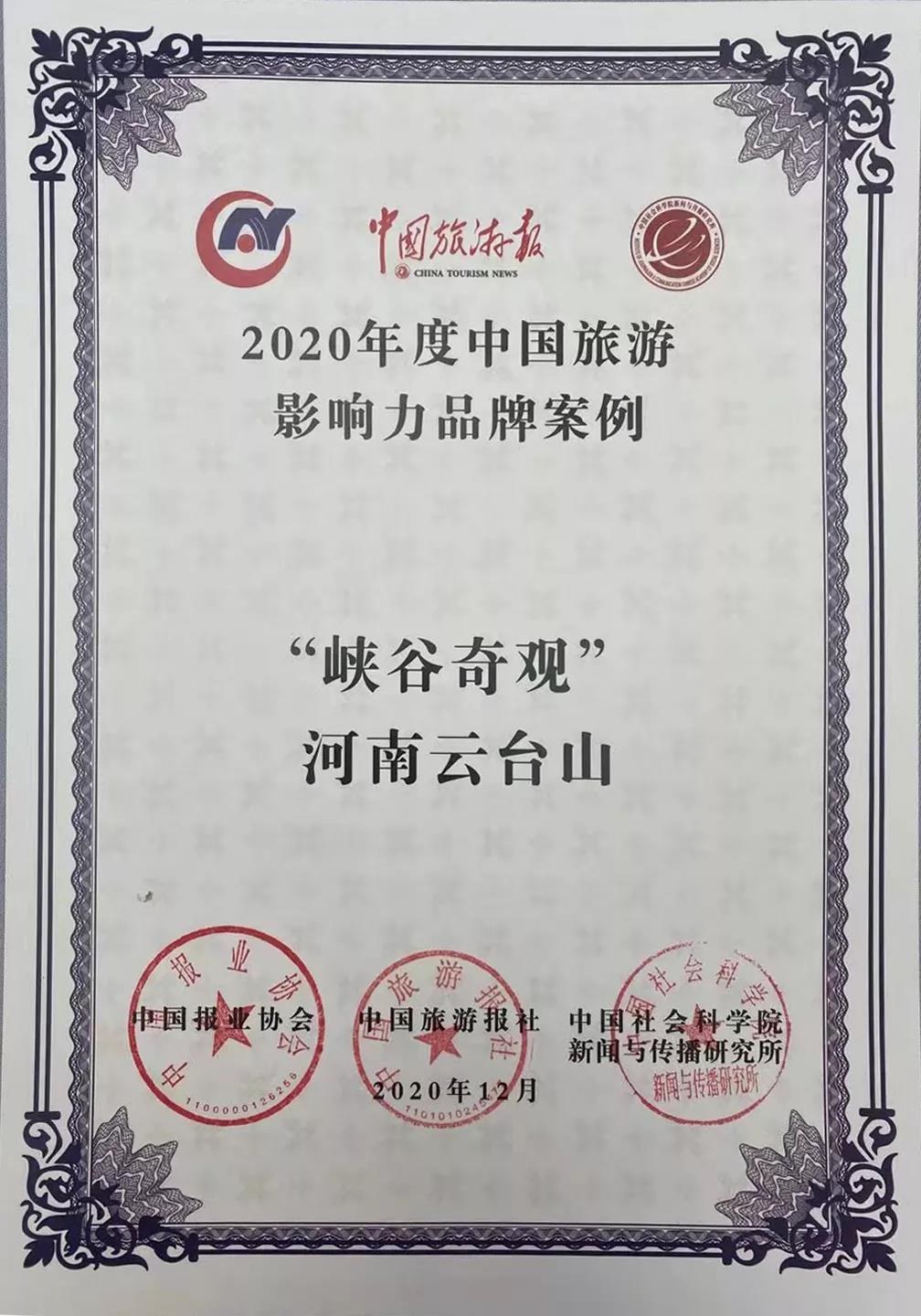 “峽谷奇觀”河南云臺(tái)山再次攬獲全國(guó)大獎(jiǎng) 重磅入選 “2020年度中國(guó)旅游影響力品牌案例”。