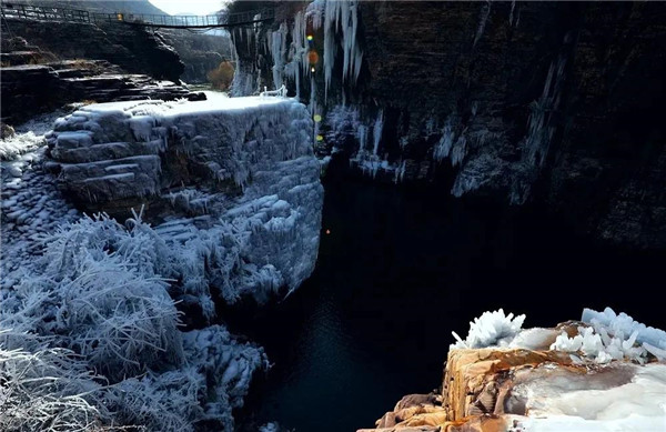 潔白晶瑩的冰掛與飛珠濺玉的瀑布相映成趣 。