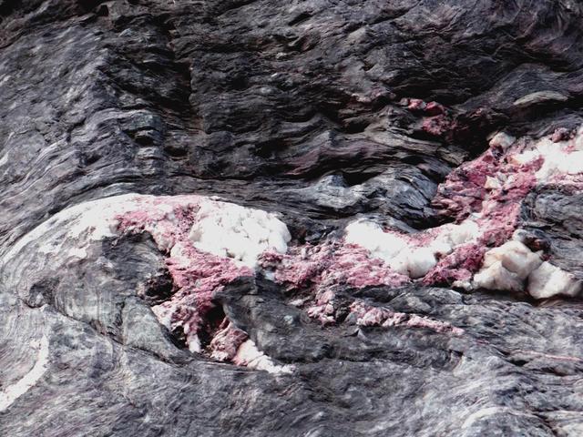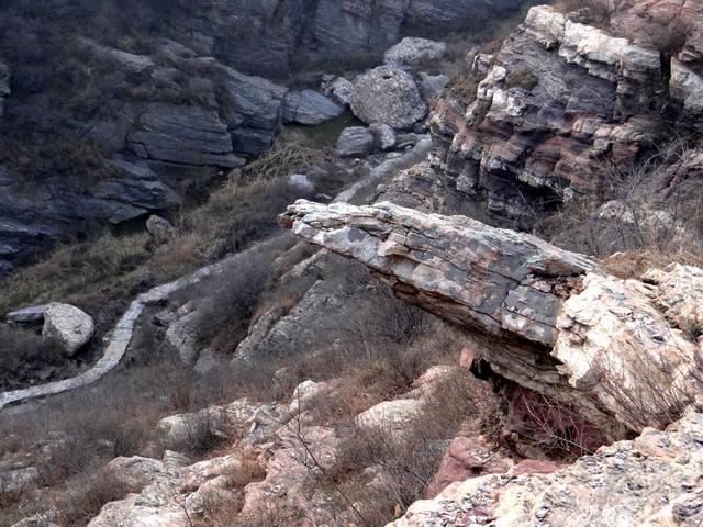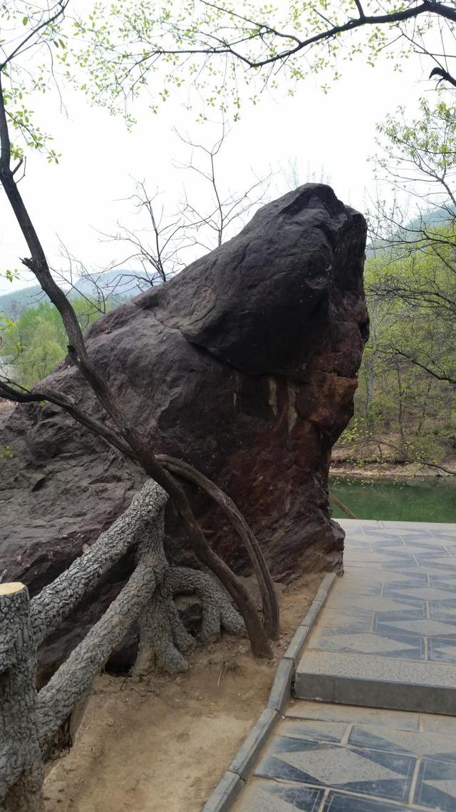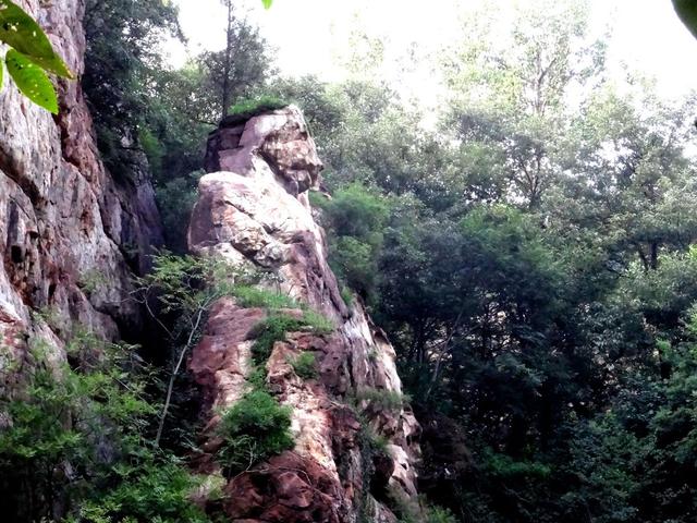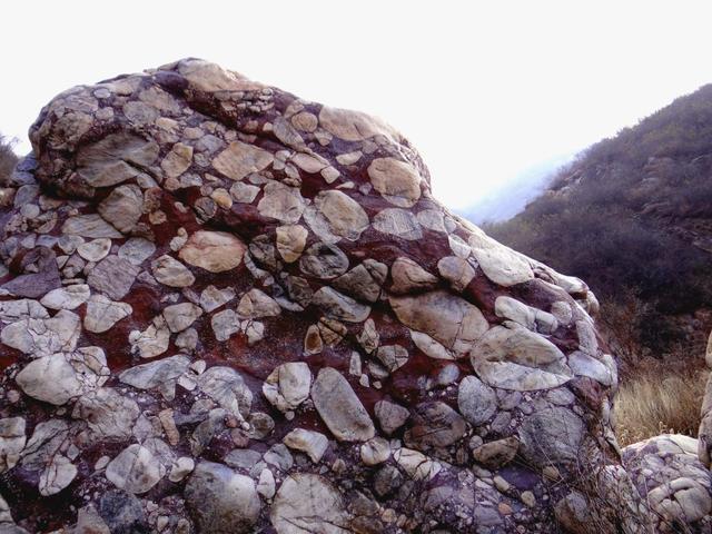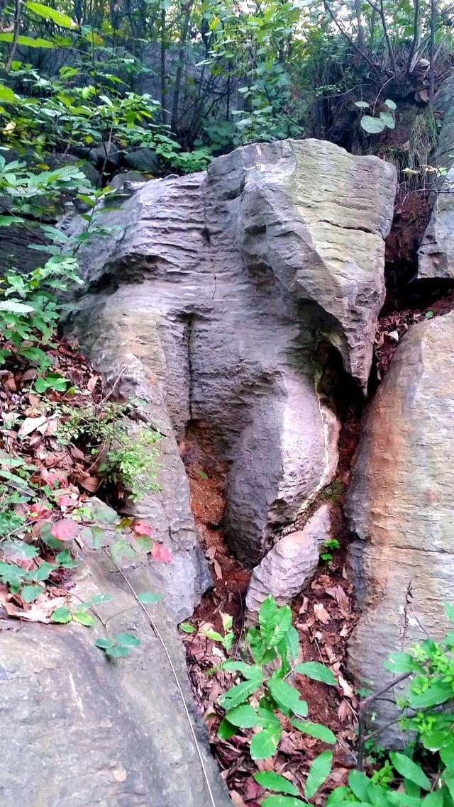 混天石位于夾津口鎮(zhèn)嵩山大峽谷。整個峽谷布滿這樣的班花巨石。有人說是王母娘娘不慎傾倒了疙瘩湯,形成此石。余倒覺得又像是大塊兒石英石和彩色水泥攪拌而成的混凝土堆成。據(jù)有關(guān)資料載,此石形成于數(shù)十億年前,在此,余且稱其為“混沌石”。咦,整座山,整個峽谷都由這種石頭形成,真不敢想象,遠(yuǎn)古時期,天崩地裂,熔漿噴發(fā),天地渾沌,天傾地覆的可怕景象,更使余平增幾分對大自然的敬畏。