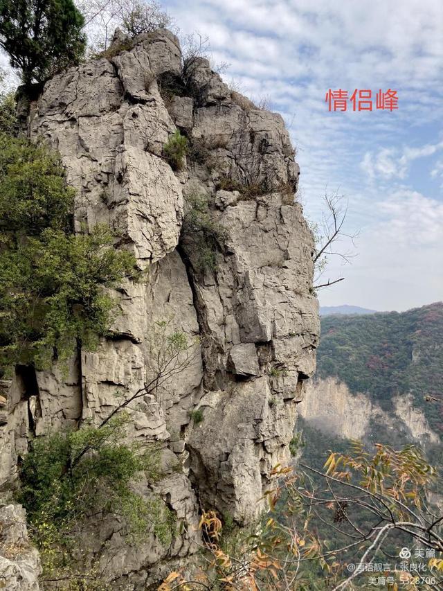 情侶峰位于新中鎮(zhèn)嶺溝寨小風(fēng)門。峭峰突兀險峻,宛若一對兒情侶,寬袍大袖,相擁而立,相偎相依,情深意濃。男子低首俯于女子耳邊私語,女子依偎男子頜下廝磨。情切切,意濃濃。
