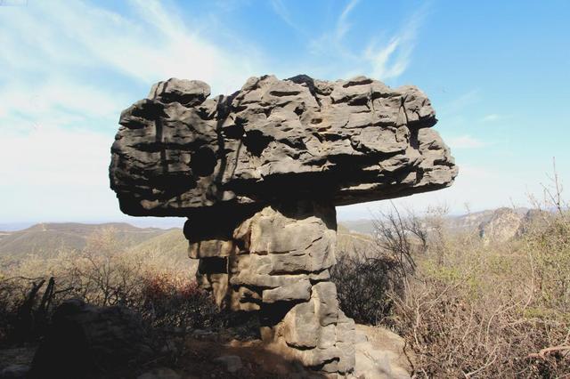飛來石 (或稱蘑菇石) 位于小關(guān)鎮(zhèn)南嶺村蝴蝶谷景區(qū)。此石形似陀螺,狀如蘑菇,又如我國第一顆原子彈試爆時的蘑菇云圖。一細(xì)小石塊支撐一大塊巨石,看似風(fēng)吹即傾,然卻堅(jiān)入磐石,立千年不倒,經(jīng)萬載不覆,巍然立于山坳,似是天外飛來,又如一顆石蘑菇獨(dú)立。游人多猜測來由,然百思不得其解。