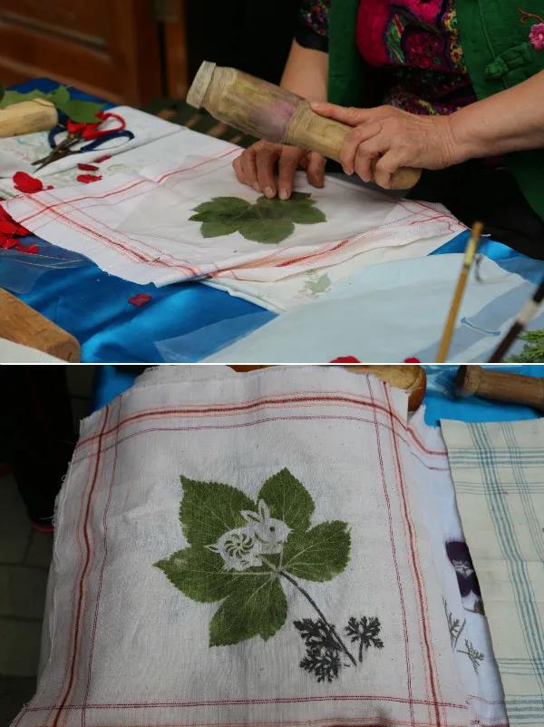 捶草印花復(fù)興于明清時(shí)期,一支棒槌、一塊白布、一棵草、一朵花,捶出一幅古樸清新的圖畫,成就一門最原始、最獨(dú)特的民間印染技藝。不同形狀的圖案躍然布上,古樸大方,別有韻味。
