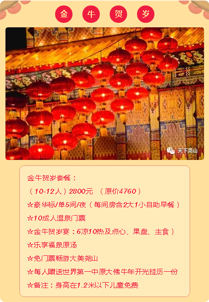 新年泡溫泉,洗舊換新,帶來一年好運,一洗周身輕,一泡心寧靜。除舊迎新,沐浴除穢是古老的傳統(tǒng)習(xí)俗。農(nóng)歷新年,一元復(fù)始,萬象更新,新年新氣象,泡泉除舊塵。辛丑年堯山福泉“新春頭湯”,泡出健康,泡出歡樂,泡出夢想!