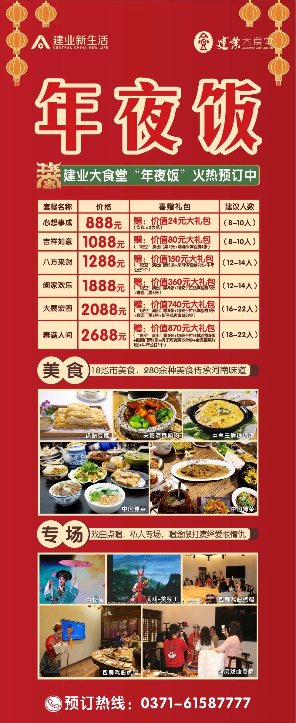 匯集18地市、280余種美食的“吃貨天堂”—— 建業(yè)大食堂,推出“預(yù)定團(tuán)圓年夜飯贈(zèng)禮包”優(yōu)惠活動(dòng)。另外,還有戲曲演唱、私人專(zhuān)場(chǎng)唱念做打演繹愛(ài)恨情仇。