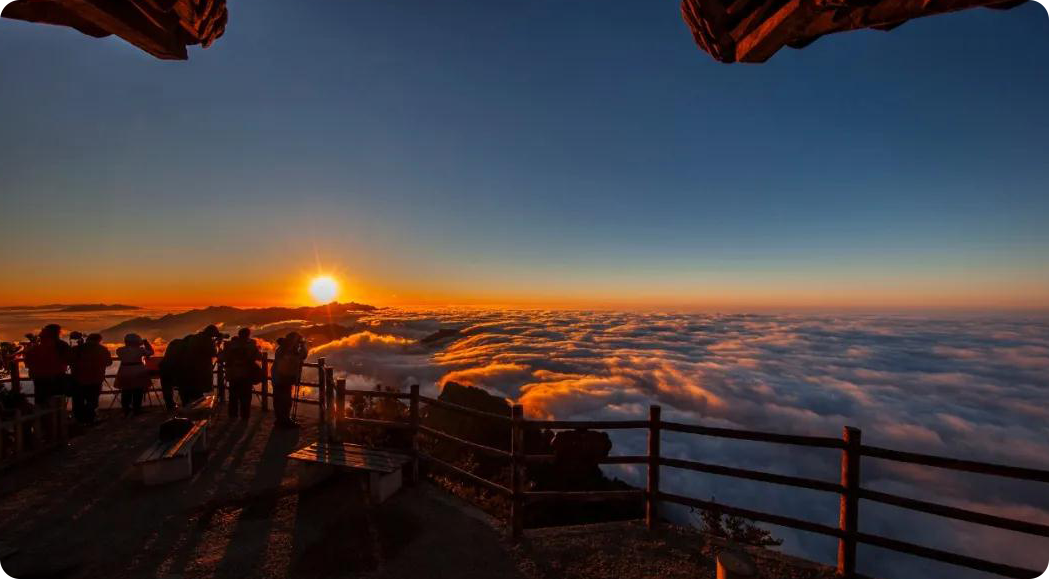 朝陽升起,金頂伴著朝霞,構(gòu)成一幅絢麗壯美的畫卷。山頂?shù)鸟R鬃嶺、金殿、玉皇頂、亮寶臺(tái)、夷希廊等地,皆是老君山觀日出的絕佳之處!