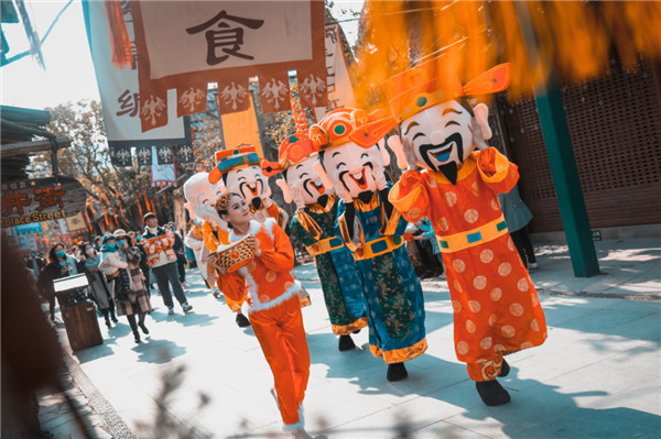伴隨著鏗鏘有力的鑼鼓聲,一對(duì)活靈活現(xiàn)的舞獅,跳躍、登高、走樁……穿越千年,踏步而來,醒獅鬧春,舞出紅紅火火的中國(guó)年。在彤燈盞盞的長(zhǎng)街古巷,游客與錦繡華裳的舞者們,一起祈福巡游,許下新年心愿。動(dòng)感的音樂、魔性的舞姿,滿園子的游客和演員,一起瘋一起玩一起載歌載舞,共赴一場(chǎng)穿越千年的盛宴。