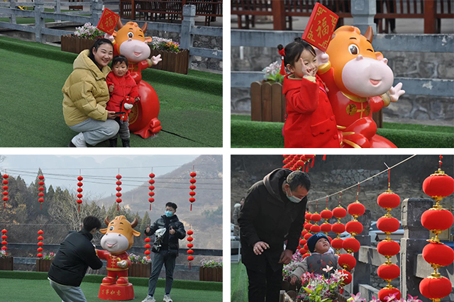 青天河春節(jié)新玩法,大年初一一大早,青天河便熱鬧起來了,游客們攜帶親友,或與憨態(tài)可掬的牛寶寶來一張親密合影。
