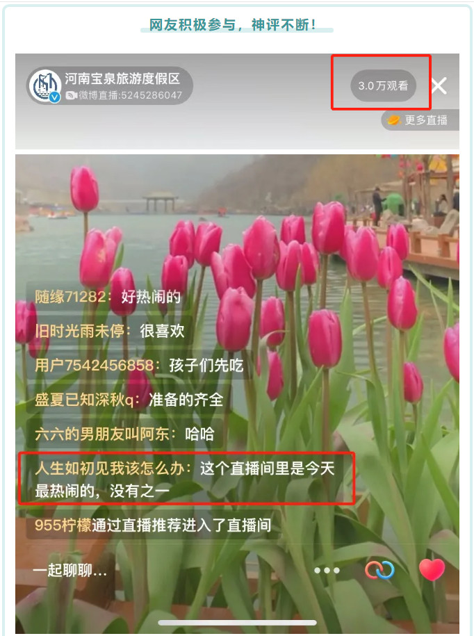 當(dāng)日上午10:30“直播中國年-云游寶泉”正式開啟,通過線上直播帶大家感受“寶泉新春游園會(huì)”的火熱現(xiàn)場(chǎng)!直播期間,在線人數(shù)高達(dá)3萬余人,互動(dòng)評(píng)論數(shù)超千條,點(diǎn)贊量破萬;線下過萬游客親臨活動(dòng)現(xiàn)場(chǎng),感受濃濃年味。