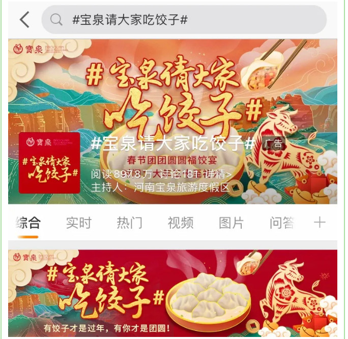 云游合家歡,就地過大年。寶泉景區(qū)與時(shí)俱進(jìn),在全國率先開啟云過年。#寶泉請(qǐng)大家吃餃子#話題一經(jīng)微博上線推出,立刻受到了全網(wǎng)廣泛關(guān)注,引發(fā)網(wǎng)友紛紛參與轉(zhuǎn)發(fā),截止目前,話題閱讀量達(dá)到了735.8萬人次,登上微博熱搜榜第三名。