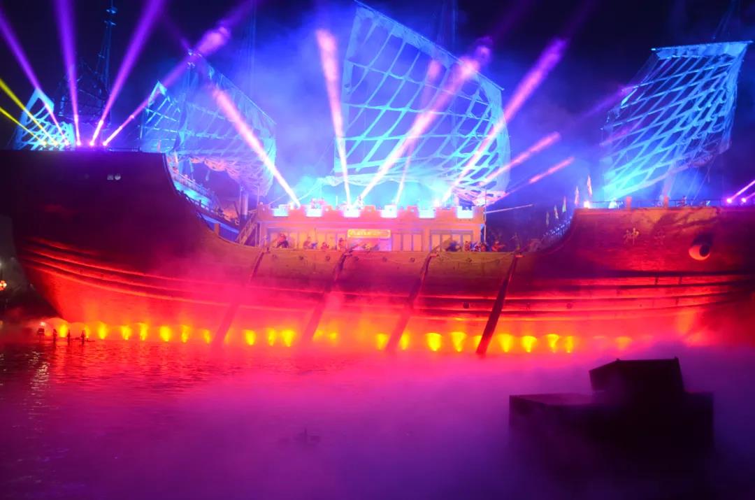 夢(mèng)幻船奇。大宋海船《神舟傳奇》大型光影水秀,水霧朦朧云霧縹緲,激光特效直沖云霄,視覺(jué)盛宴如夢(mèng)如幻,讓觀眾們久久不能忘懷。