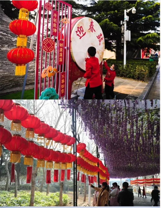 古色古香的展園以及充滿牛年新春元素的年味打卡墻吸引了不少游客打卡留念;迎春鼓那激昂、嘹亮的鼓號敲響了大家新一年的期盼;火紅的燈籠掛滿枝頭,喜氣洋洋、年味兒十足;品類繁多的美食嘉年華活動帶給游客盛大的狂歡盛宴;以“轉(zhuǎn)福-百福呈祥陣”、“轉(zhuǎn)燈-九曲黃河陣”為主題線路的迷宮,讓游客親身體驗迷失在“年味兒”中的幸福;以楓湖舞臺為棋盤的“斗象戲”,帶游客玩轉(zhuǎn)不一樣的傳統(tǒng)競技“國粹文化”;炫舞靈動的音樂噴泉讓游客贊嘆連連,玩得不亦樂乎!