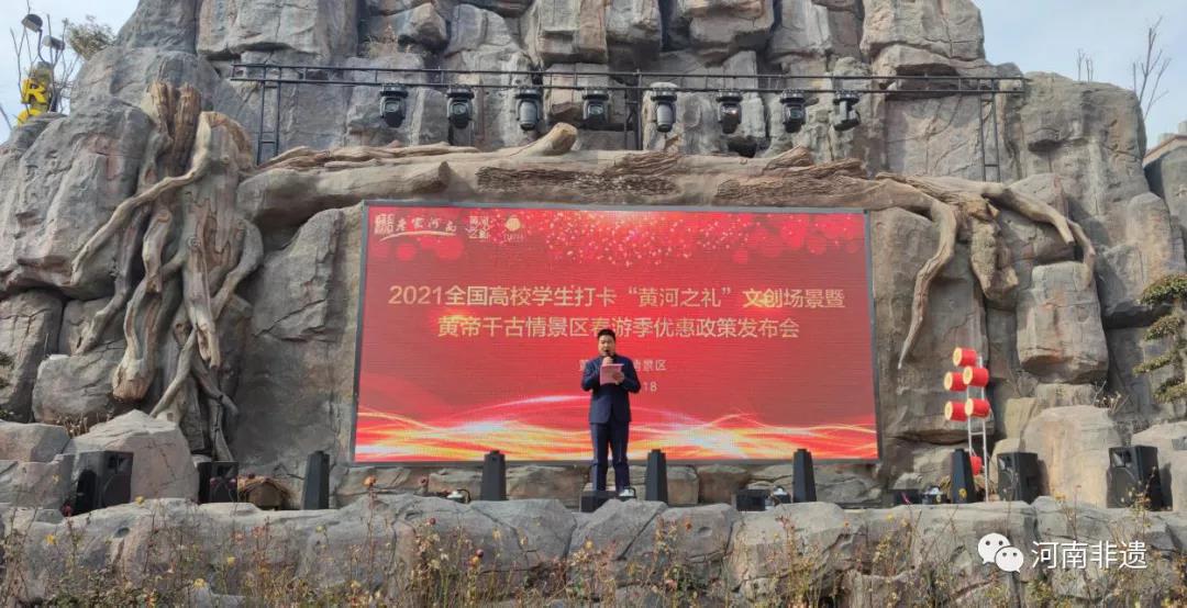 為積極貫徹黃河流域生態(tài)保護和高質(zhì)量發(fā)展的國家戰(zhàn)略,保護傳承弘揚黃河文化,促進文旅文創(chuàng)產(chǎn)業(yè)新發(fā)展,讓更多高校學(xué)生走出校園,開拓視野,體驗河南博大精深的文化。2月18日,2021全國高校學(xué)生打卡“黃河之禮”文創(chuàng)場景啟動儀式暨鄭州黃帝千古情景區(qū)春游季優(yōu)惠政策發(fā)布會在鄭州黃帝千古情景區(qū)千古情廣場舉行。