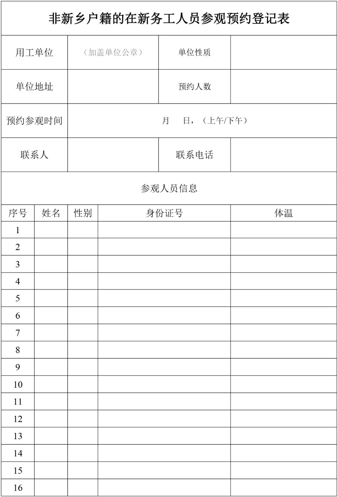 由用工單位統(tǒng)一填寫《非河南戶籍的在豫務(wù)工人員參觀預(yù)約登記表》(參見附表),于參觀前一日下午17時(shí)前發(fā)送至1278103729@qq·com郵箱進(jìn)行預(yù)約登記。