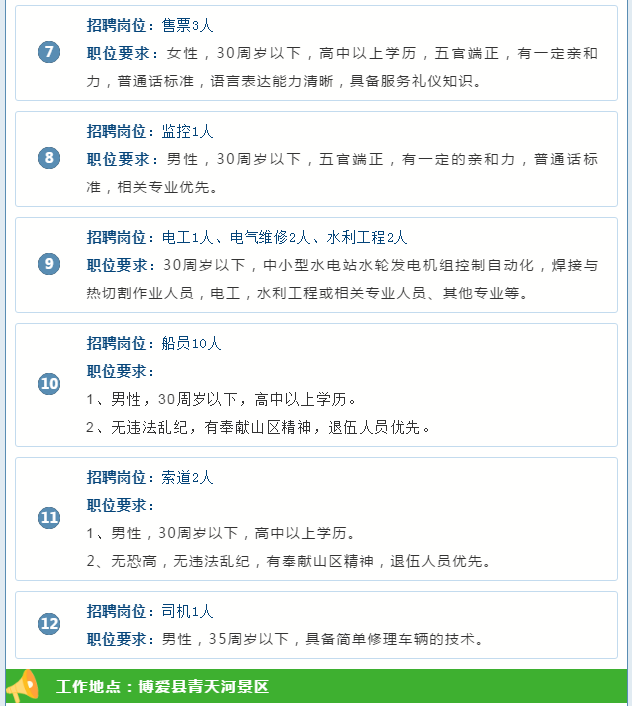 因業(yè)務(wù)需要,青天河景區(qū)現(xiàn)面向社會(huì)招聘工作人員若干,試用期一年,試用期間月薪1800元,試用期滿考核合格后,轉(zhuǎn)為正式員工,繳納五險(xiǎn)一金。