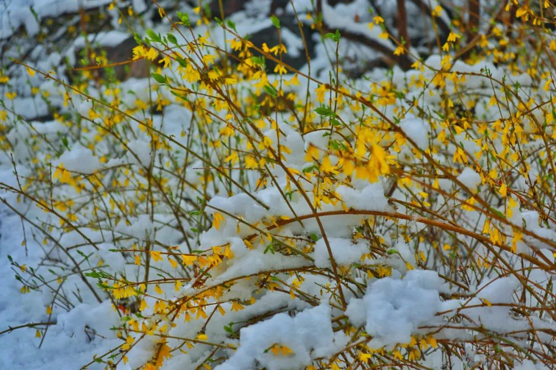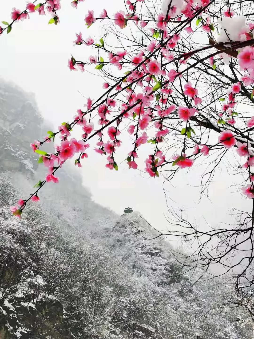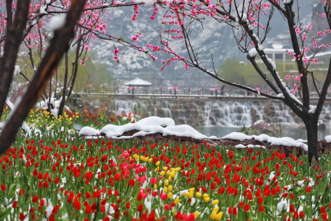 也許是春天來得太蹣跚,又或許是冬天遲遲不愿離開,皚皚白雪與寶泉春色完美融合,在白雪的襯托下更展現(xiàn)了朝氣蓬勃的生機,雪花飛舞與粉紅桃花、艷黃連翹、各色郁金香、青綠嫩葉、碧水丹山交相輝映,形成春季自然奇觀。