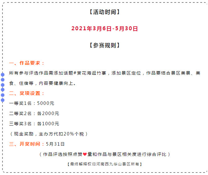 此外,西九華山抖音挑戰(zhàn)賽#賞花海逛竹寨話題開賽啦!,還有現(xiàn)金大獎(jiǎng)等您拿!