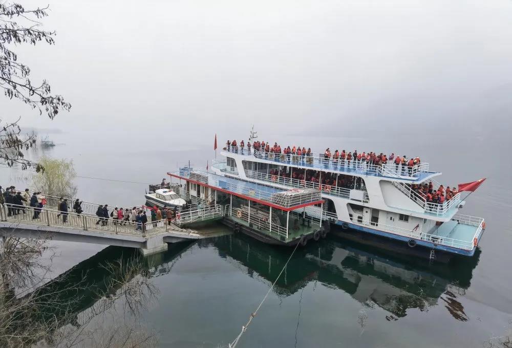 這是乘坐大型游輪的游客,通過長(zhǎng)長(zhǎng)的碼頭,抵達(dá)上下三層的豪華游輪,欣賞高峽澄湖、一步一景的三峽水景,步步風(fēng)光,步步詩(shī)畫。