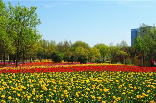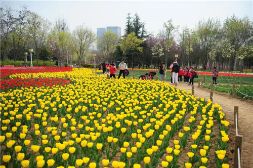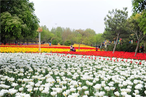 郁金香主展區(qū)在綠博園北廣場東側(cè),有班雅、純金、紫旗、道瓊斯等郁金香品種近60種、100萬株。
