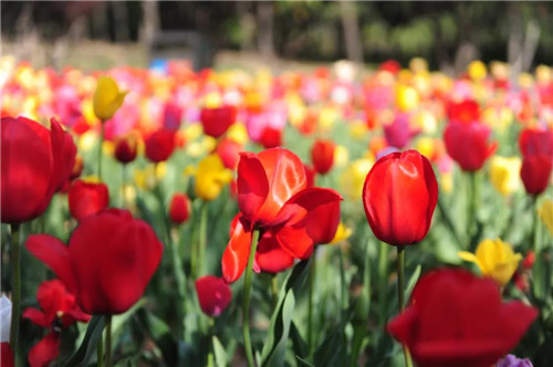 每年4月,都是花開成海的壯觀景象。不同品種、不同顏色的郁金香在園藝師的巧手下呈條帶狀分布,如同天然的彩虹花田。郁金香花型有杯型、碗型、卵型、球型、鐘型、漏斗型、百合花型等,有單瓣也有重瓣;ㄉ邪、粉紅、洋紅、紫、褐、黃、橙等,有單色、有復(fù)色,而且深淺不一,各種顏色的郁金香組成了漂亮的五彩海洋。