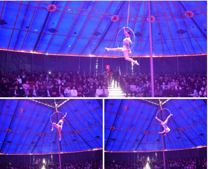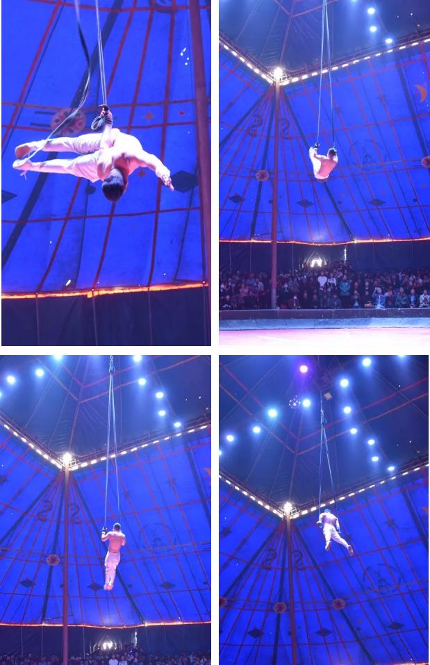 最高的吊環(huán)表演像精靈一樣,完全沒有防護,在高空中自由舒展,做出各種驚險動作,你的呼吸和眼睛都被她抓住了。呈現(xiàn)得又特優(yōu)雅,完全是《中國達人秀》水準。