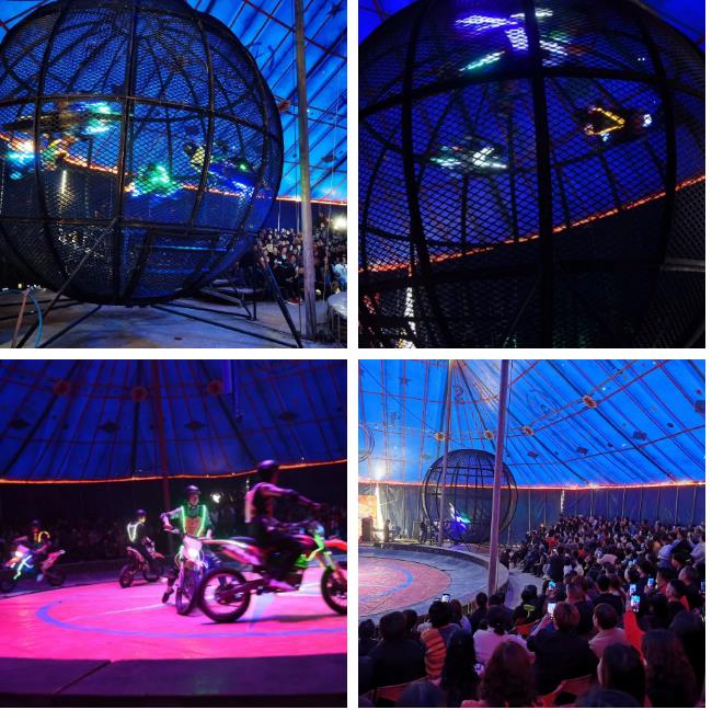 環(huán)球飛車作為壓軸,算得上是一個小時皇家大馬戲表演中的核武器。在這直徑不到5.5米的鐵球中,四位特技摩托車手上演著每秒80邁的生死時速。每個人之間的間隔只差0.02秒,千鈞一發(fā)的緊張感,直到車手紛紛駛出鐵球,馬達的轟鳴聲消停下來,才算被破解。