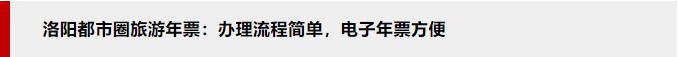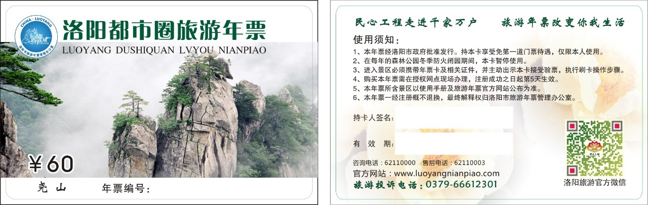 目前,洛陽都市圈旅游年票包含53家景區(qū),門票總價(jià)2522元,每張銷售價(jià)格60元。其中,洛陽市36家:龍門石窟、白云山、龍?zhí)洞髰{谷、雞冠洞、隋唐洛陽城明堂天堂景區(qū)、應(yīng)天門遺址博物、九洲池遺址公園等。濟(jì)源市5家:黃河三峽、王屋山、五龍口、小溝背、濟(jì)瀆廟。焦作市2家:青天河、神農(nóng)山。汝州市3家:怪坡景區(qū)、九峰山景區(qū)、青瓷博物館,魯山縣1家:堯山景區(qū)。三門峽市4家:黃河丹峽景區(qū)、仰韶大峽谷、仰韶仙門山景區(qū)、豫西大峽谷。山西省晉城市2家:九女仙湖、相府莊園。
