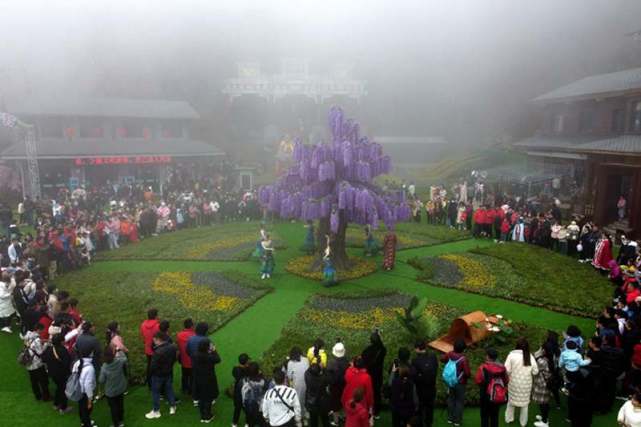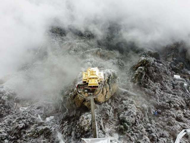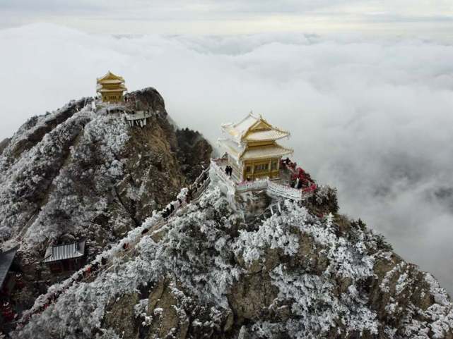 河南洛陽(yáng)老君山是伏牛山主峰所在地,海拔2000余米,山頂海拔高氣溫低,山上山下溫差大,呈現(xiàn)著兩種不同的景觀, 山上清明時(shí)節(jié)雪紛紛,雪花飛舞,玉樹(shù)瓊枝與山頂古色古香的建筑群交相輝映,美如仙境。