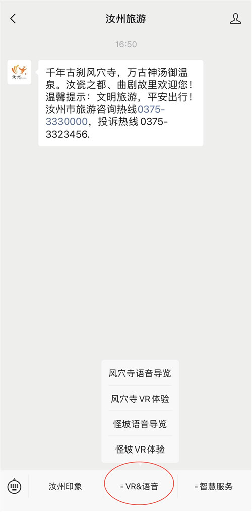1、關(guān)注“汝州旅游”公眾號(hào),進(jìn)入公眾號(hào)主界面,選擇下方功能欄 “VR&語(yǔ)音”