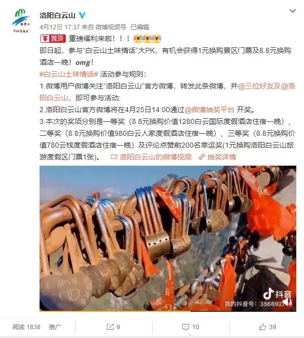 2. 洛陽白云山官方微博將在4月25日14:00抽取一、二、三等獎及200名幸運獎。
