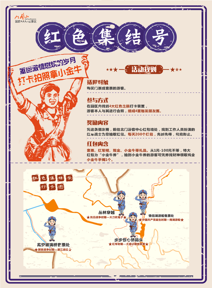 勇士們,讓我們?cè)?ldquo;紅色集結(jié)號(hào)”的號(hào)召下,打卡四大場(chǎng)景,共同回憶那段崢嶸歲月。打卡成功后,憑借本人打卡照片轉(zhuǎn)發(fā)朋友圈,就可以到北門情侶谷游客中心“紅色集結(jié)令”獎(jiǎng)品兌換處抽取禮品。紅軍帽、百元現(xiàn)金大獎(jiǎng)、景區(qū)暢玩通票驚喜不斷,更有純金小牛超級(jí)大獎(jiǎng)等你來拿。