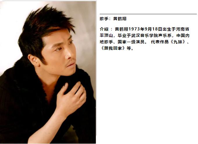 歌手:黃鶴翔介紹 :黃鶴翔1973年9月18日出生于河南省平頂山,畢業(yè)于武漢音樂(lè)學(xué)院聲樂(lè)系,中國(guó)內(nèi)地歌手、國(guó)家一級(jí)演員。 代表作品《九妹》、《跟我回家》等。