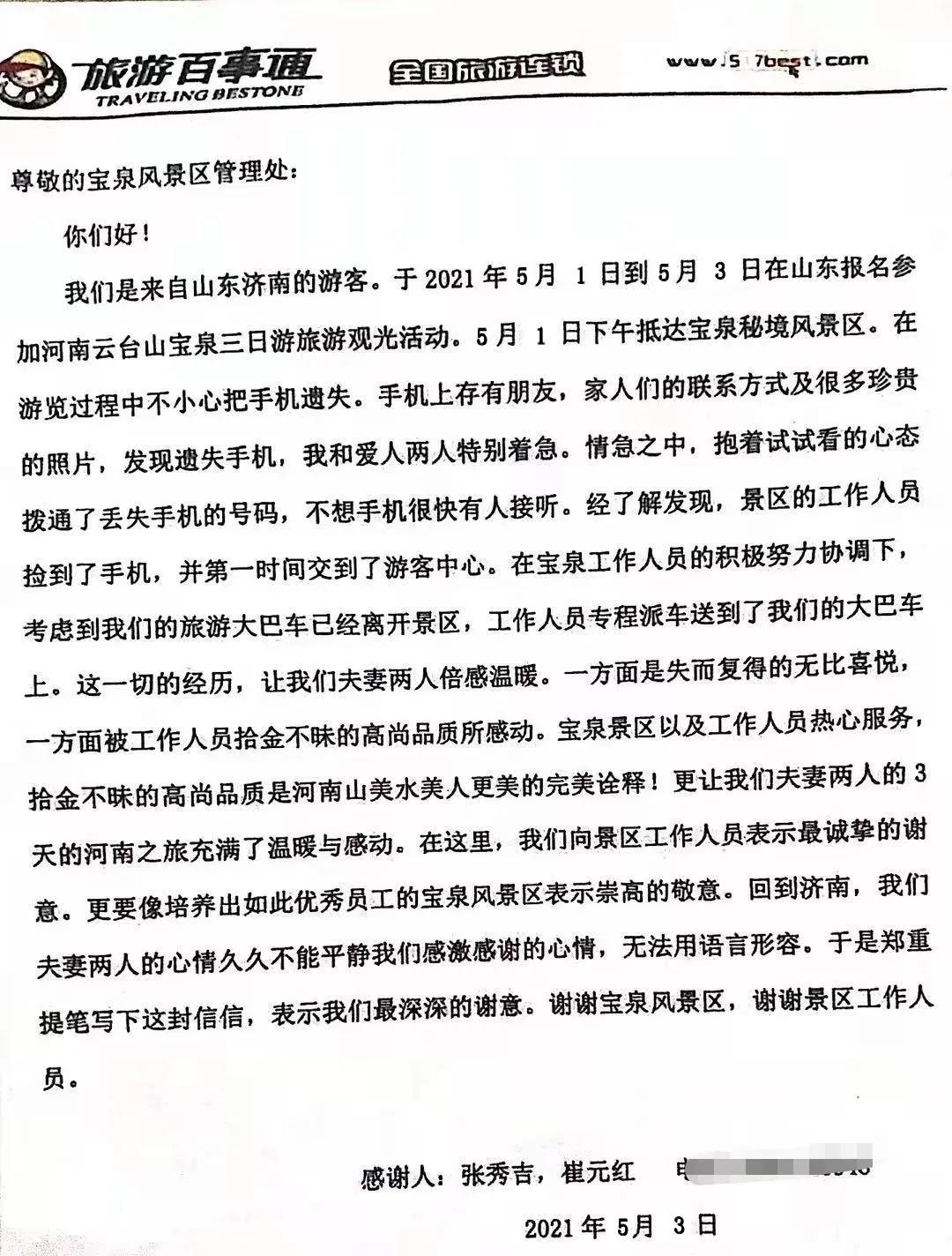 5月1日下午13:48景區(qū)員工田景艷在轉(zhuǎn)運(yùn)大巴車上撿到手機(jī)一部,第一時間交與景區(qū)游客中心,在14:08景區(qū)游客中心將手機(jī)歸還失主……