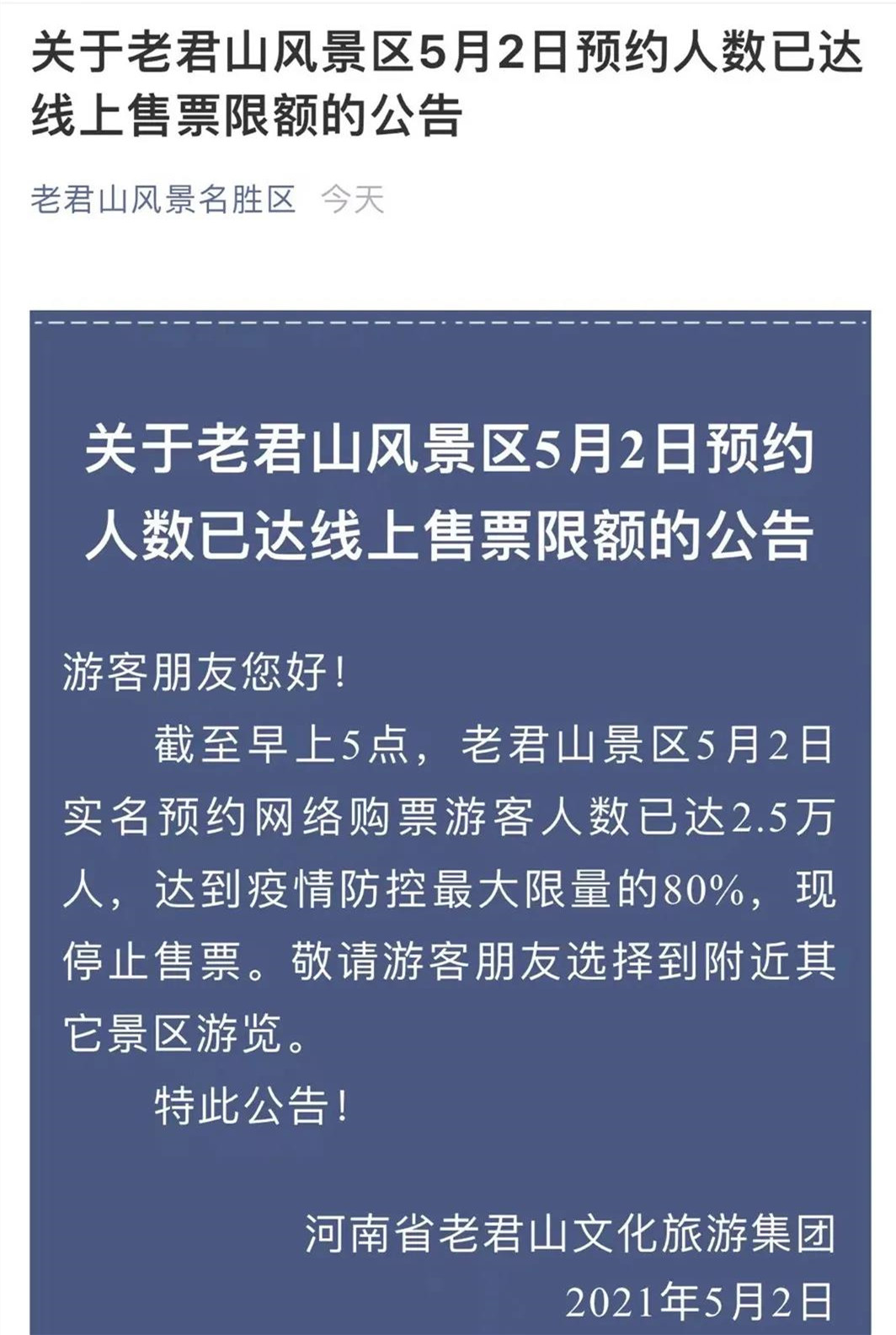 在“五一”假期,景區(qū)采取分流疏導(dǎo)、分時(shí)段、間隔性放行、分路段管理的方式來維護(hù)游覽秩序,避免瞬時(shí)擁堵,嚴(yán)格遵守游客量不超過疫情防控的80%的原則,利用大數(shù)據(jù)進(jìn)行實(shí)時(shí)檢測,并通過各大平臺(tái)、景區(qū)廣場LED大屏告知等方式,及時(shí)發(fā)布公告停止售票,杜絕無預(yù)約人員入園。