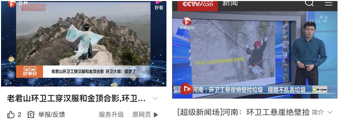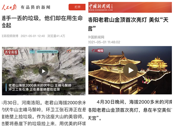 五一期間,老君山絕美風(fēng)光、環(huán)衛(wèi)工懸崖絕壁撿垃圾、環(huán)衛(wèi)工穿漢服和金頂合影、金頂首次亮燈美似“天宮”等再次上升熱點(diǎn),相繼被央視新聞、人民日報(bào)網(wǎng)、中國新聞網(wǎng)、公共頻道、CCTV-17等欄目報(bào)道,引起社會(huì)各界人士的廣泛關(guān)注。
