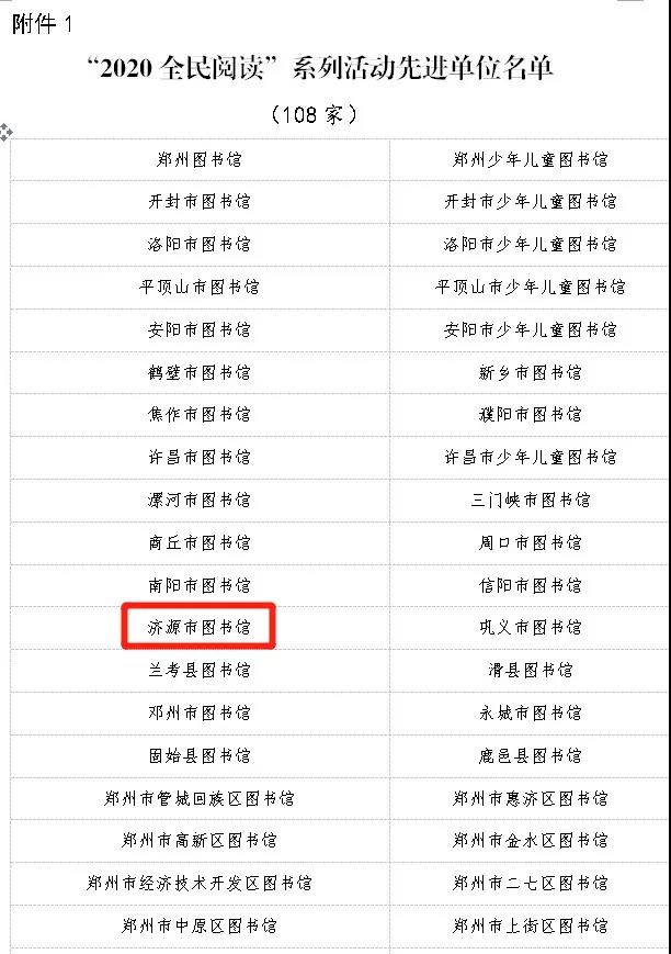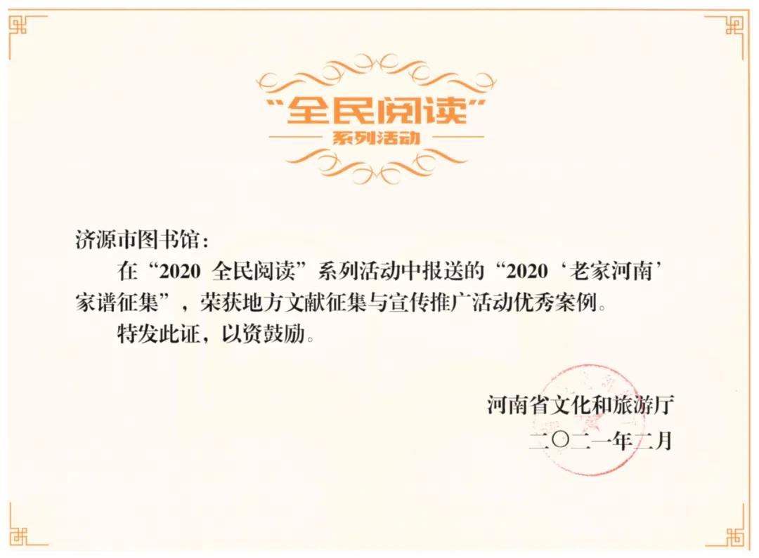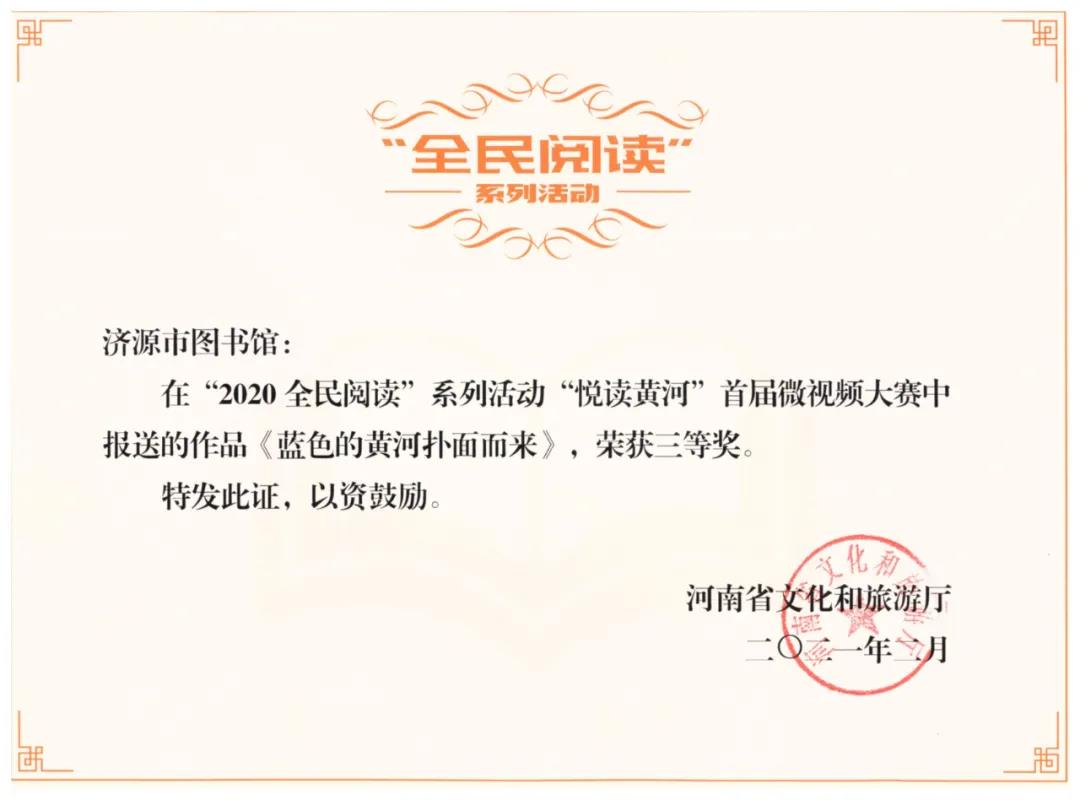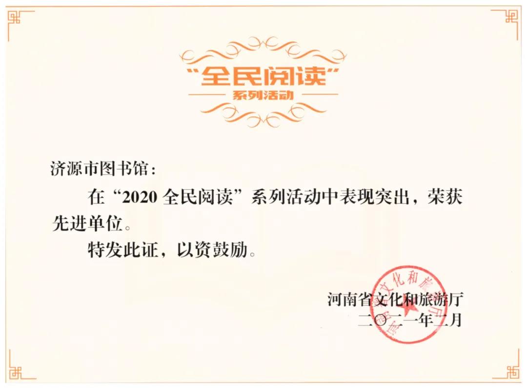 近日,河南省全民閱讀先進(jìn)單位和先進(jìn)個人評選結(jié)果公布,濟(jì)源市圖書館被河南省文化和旅游廳評為“2020年度全民閱讀先進(jìn)單位”,其中“悅讀黃河”首屆微視頻大賽報送作品榮獲三等獎、“2020‘老家河南’家譜征集”榮獲地方文獻(xiàn)征集與宣傳推廣活動優(yōu)秀案例。這是我館第9次榮獲河南省“全民閱讀先進(jìn)單位”榮譽(yù)稱號。