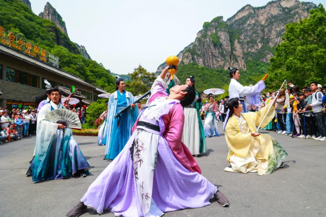 今年五一期間,云臺山推出全新演藝《七賢游園》。竹林七賢、王維穿越古今悠然而來,以山為景,以水為臺,在秀美山水的映襯下,或執(zhí)扇而立,或持劍而舞,帶領游客夢回魏晉;《云臺山麗人行》蹁躚而來,在自然山水間翩翩起舞,吸引游客駐足觀看。