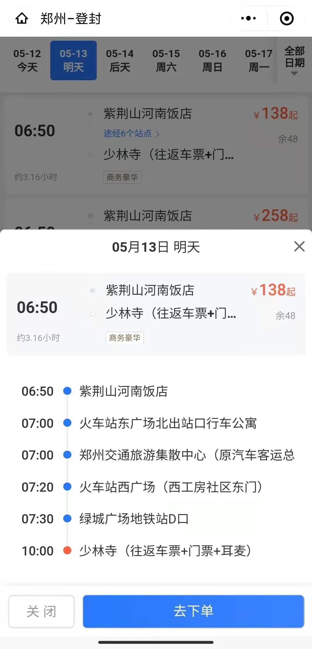 少林寺線路包含往返車票、門票、耳麥,票價(jià)138元;少林寺加龍門石窟線路,包含往返車票、門票、耳麥,票價(jià)258元。少林寺和少林寺加龍門石窟線路具體發(fā)車時(shí)間及站點(diǎn):