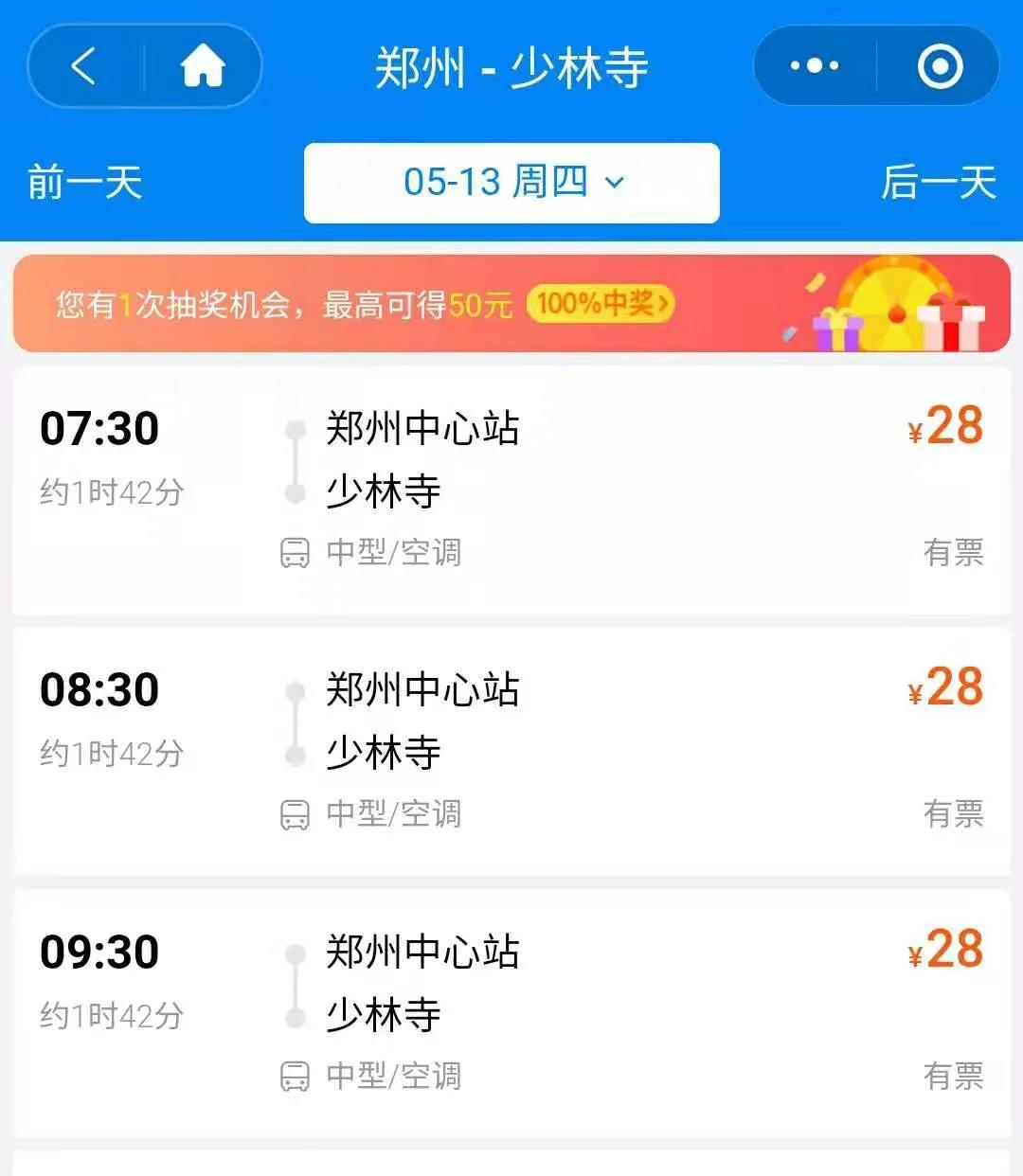 另外每天還有3班車從鄭州中心站發(fā)往少林寺,票價(jià)為28元。