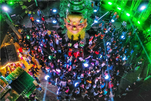 夜晚的中原竹寨顯露出另一副神秘的容顏,既有燈光璀璨,也有靜謐神秘,夜晚游客一邊欣賞夢幻燈光秀一邊紛紛參與節(jié)目互動中!