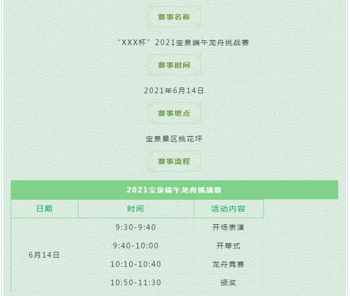 1、參賽項(xiàng)目:本次2021寶泉端午龍舟挑戰(zhàn)賽共設(shè)置龍舟競(jìng)速挑戰(zhàn)賽、龍舟拔河趣味賽兩大主題賽事,所有參賽隊(duì)伍均須參加以上項(xiàng)目;
