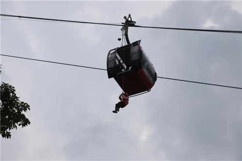 現(xiàn)場救援人員緊密配合,動作嫻熟,迅速到達(dá)游客所在的吊廂上方,利用救援裝具打開吊廂門,將被困人員安全護(hù)送到地面。