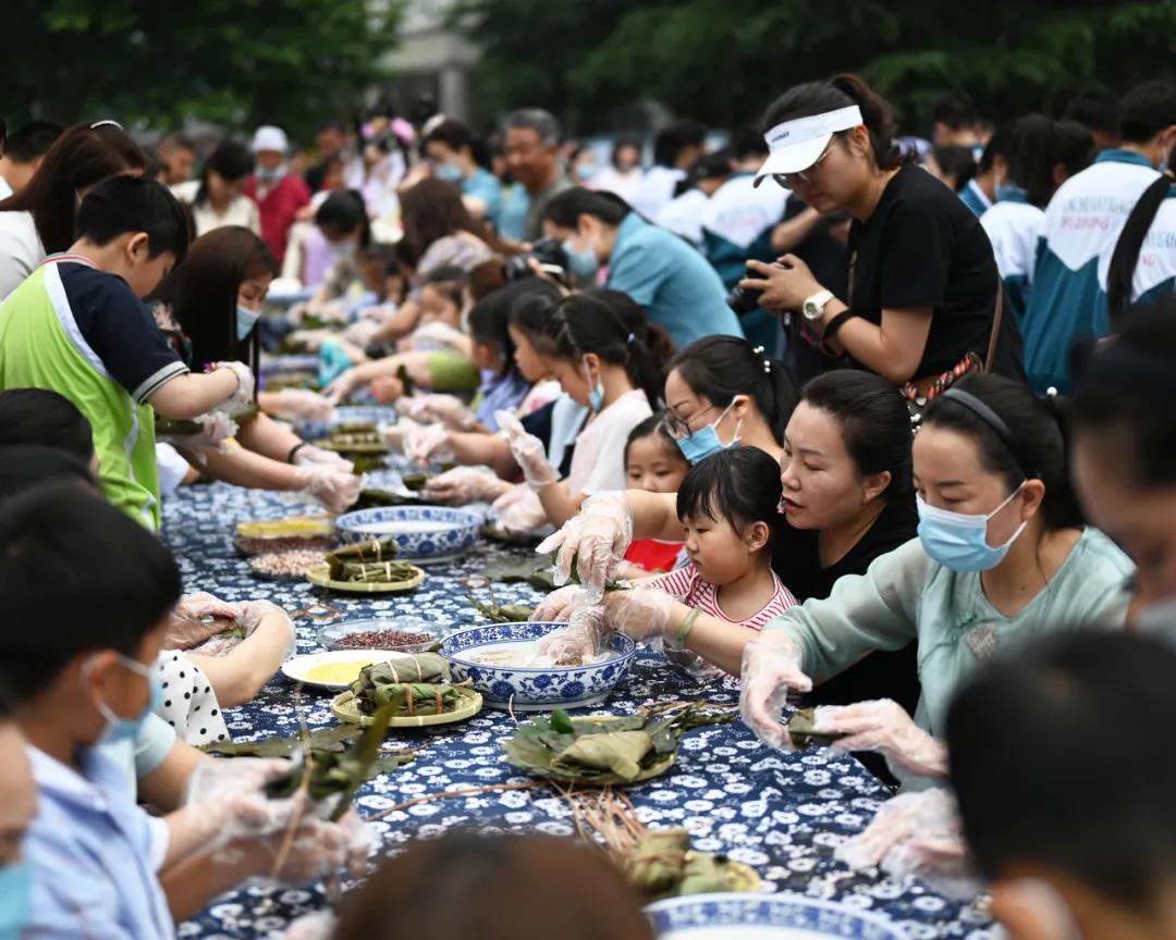 豫西端午多食槲包,欒川縣第一實(shí)驗(yàn)幼兒園、一高附中的師生及眾多游客在“村姑”、“溶洞仙子”的幫助下拿著槲葉,包上小米、大米、黍米、紅豆、紅棗體驗(yàn)包槲包。