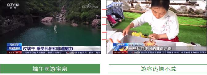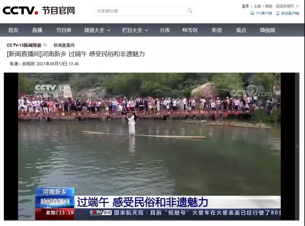 6月13日,在端午小長假第2天中午13:19,央視CCTV13新聞頻道《新聞直播間》以“河南新鄉(xiāng):過端午 感受民俗和非遺魅力”為題,通過非遺絕技“獨(dú)竹漂”、傳統(tǒng)民俗包粽子,對寶泉景區(qū)精彩有趣的端午節(jié)進(jìn)行了展開報(bào)道。
