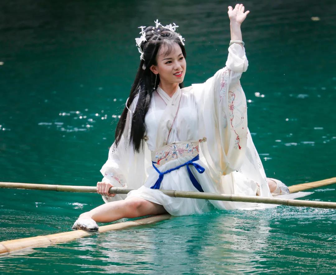 腳踩一根竹筒,手握一根長桿,穩(wěn)穩(wěn)地在水面上劃過,貴州的獨(dú)竹漂非遺傳承人楊柳,時(shí)而翩翩起舞,時(shí)而輕盈滑翔,身著古裝在水面上飄過,宛如一幅夏日仙境圖。